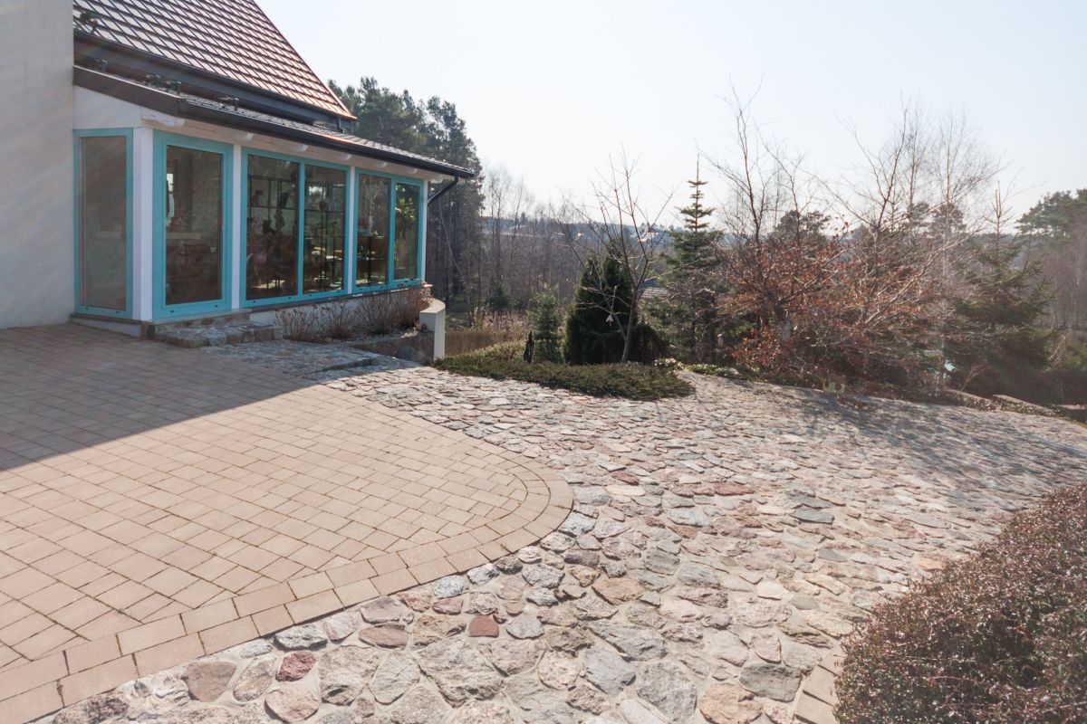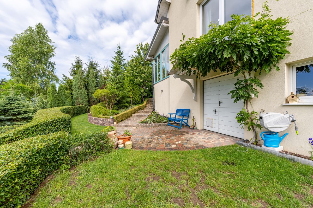 Do części rekreacyjnej prowadzą kamienne schody otulone pięknym żywopłotem z Ligustrów.