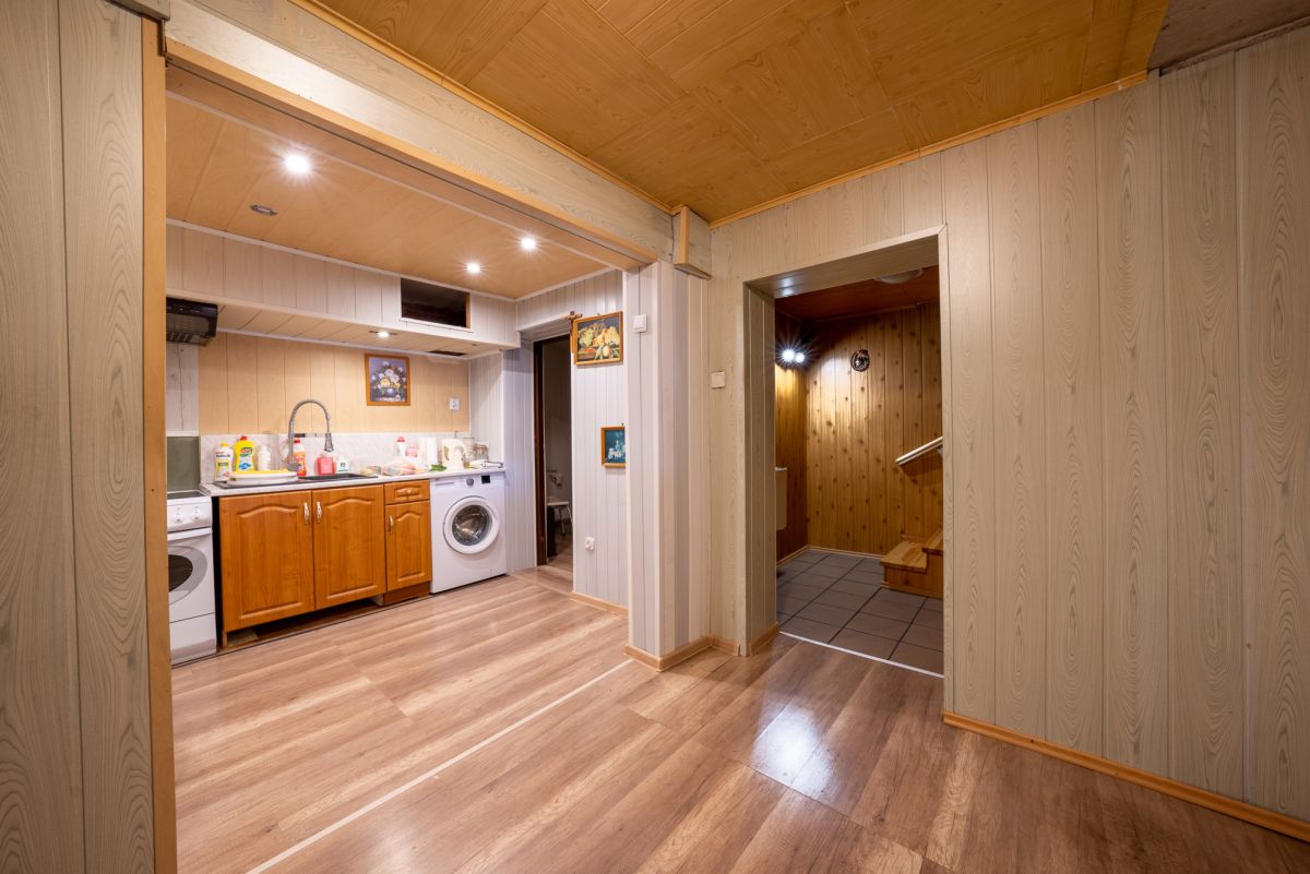 PARTER: duży salon, pokój, kuchnia, spiżarka, łazienka, przedpokój, sień