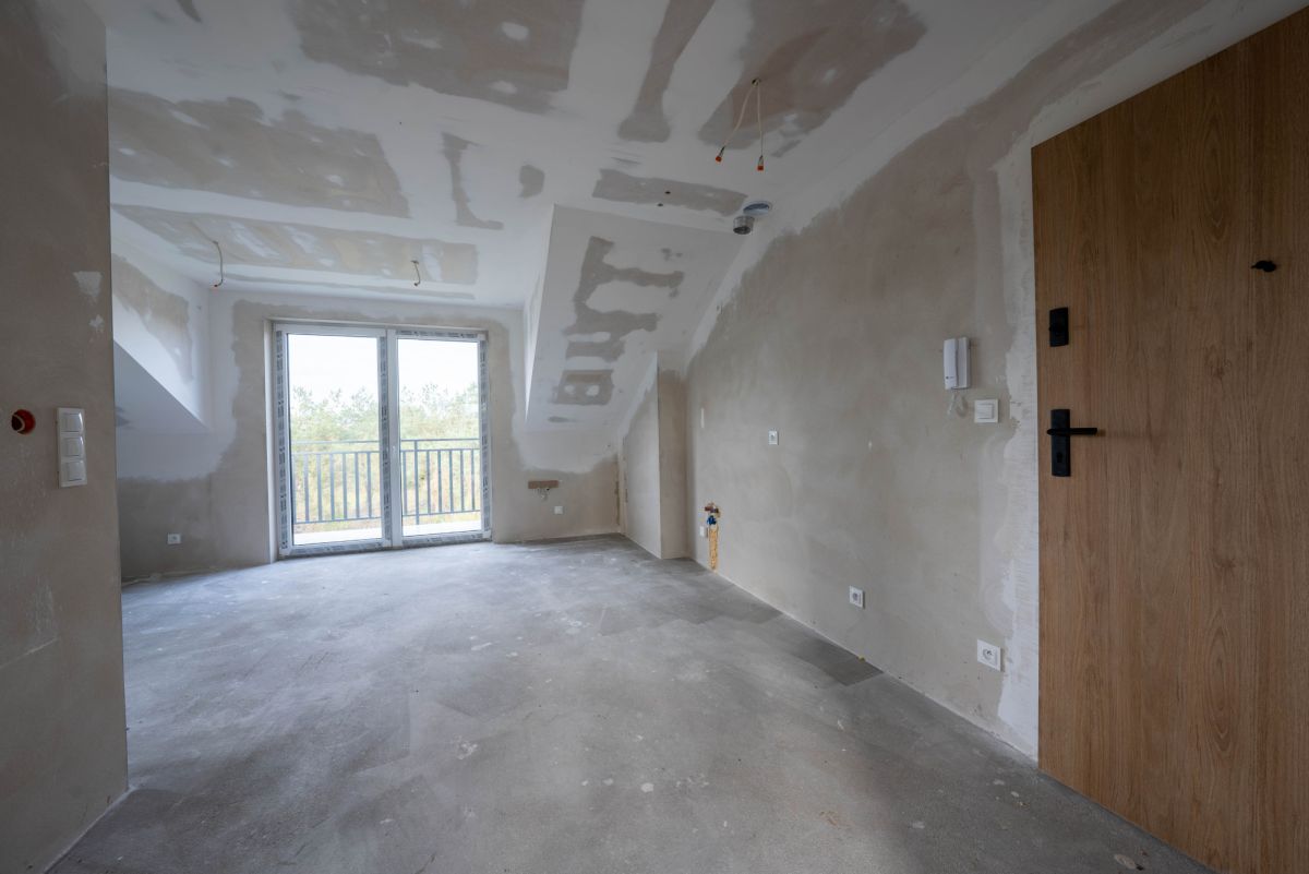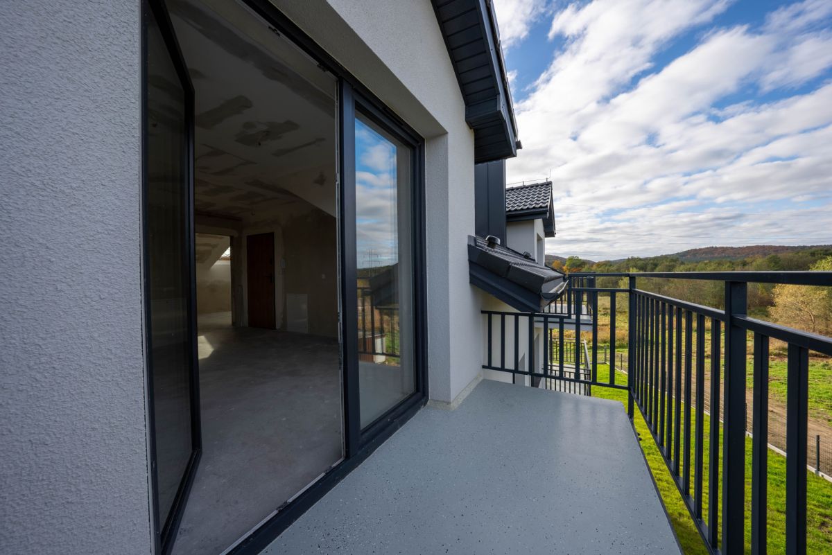 Balkony zabezpieczone estetyczną powłoką z żywicy epoksydowej , okna Ventana 3 szybowe, ogrzewanie podłogowe zasilane kotłem gazowym Beretta, ściany otynkowane, cementowo wapienne bez gładzi.