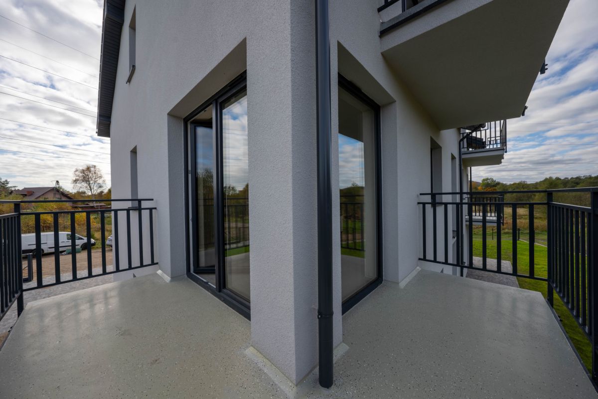 Balkony zabezpieczone estetyczną powłoką z żywicy epoksydowej , okna Ventana 3 szybowe, ogrzewanie podłogowe zasilane kotłem gazowym Beretta, ściany otynkowane, cementowo wapienne bez gładzi.